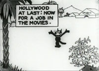 Felix in Hollywood1923. Sullivan Studios. Directed by Otto Messmer. So this is how Felix got into the movies! Cecil B. DeMille awarded him a "long-term contract" after a camera crew caught him rescuing Douglas Fairbanks from a pack of mosquitoes. It would be poetic if the cartoon in which this happens, Felix in Hollywood, were actually Felix's debut, but he was already a well-established character, if not as famous as he would become later in the 20s. His visit to LA is just one of his adventures, not his moment of self-actualization. Anyway, Felix never actually "worked" in Hollywood; a creation of New York-based Sullivan Studio, he was definitely an East Coast type. So Felix goes to LA as your standard movie hopeful. The trip west is actually the idea of a ham actor friend of his (Felix goes along disguised as the actor's valise). The sequence where Felix raises money for the trip by sticking people's shoes to the street with chewing gum and then selling them new shoes is by far the cleverest and best animated of the film. Once he arrives in Hollywood, all of the animation energy goes into caricaturing (and not very well) famous movie personalities. There's a funny scene where Felix, as part of his audition for the head of Static Studios (Will Hays?), imitates Charlie Chaplin and then bumps into Chaplin himself (that is, a drawn caricature of Chaplin) who chases him out of the studio. It's interesting that movie star caricatures, that in-joke staple of Warners cartoons in the 30s and 40s, are almost as old as Hollywood itself. Felix in Hollywood is the earliest example I know, but someone can probably trump me on this. Like characters played by Colleen Moore, Harold Lloyd, Marion Davies,