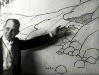 Gertie the Dinosaur1914. Vitagraph. Animated by and starring Winsor McCay Animated films were self-referential from the get-go. They are obsessed with their own creation, eagerly showing off the clever tricks and prodigious labors that brought them into being. These early "trick films" provide vibrant examples of movies that may offer humor, anecdote and spectacle but are primarily about themselves. Gertie the Dinosaur is actually entitled Winsor McCay/America's Greatest Cartoonist/and "Gertie." It sounds like a vaudeville act and originally it was. McCay, a famous Hearst editorial cartoonist, sometimes appeared on stage doing quick-draw "lightning sketches" where he would transform one image into another with a few strokes of the pencil. When he started experimenting with animated films, he incorporated the films into his act. He would begin the Gertie show with a lecture on how the film was created, draw Gertie on a large pad before the audience's eyes, and then segue into the projected film, which he would interact with. He would give Gertie orders as though she were a live trained elephant, throw a pumpkin toward the screen for Gertie to catch, and later seem to climb into the film and onto Gertie's back (the real McCay disappeared behind the screen and an animated on-screen "McCay" took his place). In its current form, Gertie has to do without a live artist-impressario, but McCay is still very present. He is featured in a live-action introduction recounting the story of how Gertie came to be. Visiting the fossil room of a museum with some friends, McCay bets them that he can "make the dinosaurs live again." Next we see him drawing away at his studio. He shows a visitor the stacks and stacks of drawings he has completed, explaining "I made 10,000 cartoons, each one a little bit different from the preceeding one." At the payoff dinner, McCay draws Gertie for his friends and then brings her to life. "Gertie will do everything I tell her to do," he assures his friends, and--seemingly in response to McCay's commands, here delivered via intertitles--Gertie bows, raises her feet, and then gets distracted by a sea serpent and a passing mammoth and has to be reprimanded (she cries). The Gertie cartoon is charming, and especially impressive compared to other animations made at that time. A commercial artist of the first rank, McCay manages to invest the dinosaur with a sense of weight and bulk, a rolling walk, a whiplash tail, and a belly that moves in and out as she breathes. He really does "make the dinosaurs live again," and it's worth remembering that in 1914 no one had imaginged how a dinosaur might have moved (we're now accustomed to animated, animatronic and computer-generated dinosaurs, but McCay's was the first). McCay gives Gertie a personality, and uses three-dimensional space brilliantly, as the dinosaur lumbers from background to foreground, hurls boulders into the distance, etc. But without the framing story, Gertie would be far less interesting than it is. Gertie the Dinosaur exemplifies the dual fascination of most films of that era--they are both technological marvels and narrative entertainments. As much as we have been prepared to acknowledge Gertie as simply a collection of "10,000 drawings" created by McCay and photographed one at a time, there comes a moment when we find ourselves beginning to believe that a living creature cavorts before us. It's like the moment when an airplane first lifts off the ground--suddenly the mechanics disappear and we're airborne. The very action of the Gertie sequence refers to this process. As in many early cartoon plots, the animator draws a character, the character starts to move on its own, and soon gets away from its creator--disobeying, sassing, playing tricks, generally taking on a life of his own. If we paused to think about it, of course, we'd realize that a drawn character can't really do anything on its own, any more than a ventriloquist's dummy can. Alternately remembering and forgeting that Gertie (and all cartoons, and all movies) is an artificial construction given the illusion of life by optical tricks and our own imagination, creates that wonderful tension that we call self-referentiality. Many cartoons of the teens and 20s follow Gertie's strategy of playing with the relationship between creator and creation. We've seen the live-action Fleischer brothers and the animated Koko the Clown tormenting each other. I'll be writing soon about cartoons where animator Walter Lantz and his Pete the Pup go off on adventures together. And of course we all grew up watching Walt Disney chat with Mickey and Donald as though they were his employees. In the early, novelty days of the cinema, and in many cases into the present, filmmakers wanted to make sure that audiences never forgot the hard work and great skill behind the illusion. And audiences found the illusion more--not less--magical when reminded that someone had made it all happen. (1/6/96) |