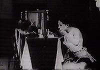 over the very camera that created him. Charlie does come back, disguised as a glamorous woman (the title reads: "Next day, a fairy floated into the studio."). "Senorita Chaplino," as she is called, flirts outrgeously with that same producer, who leads her into that same dressing roompossibly to put on a costume for a screen test, possibly to undress for a tryst. As soon as he's alone, Charlie pulls off his wig and scrambles into his Tramp costume. Meanwhile, a bunch of the Keystone actorsincluding recognizable ones like Snub Pollard and Mack Swain complain about have been evicted from their dressing room. The producer sweeps back into the dressing room andas we did earlierdiscovers the Tramp in place of the person he expected. He sees the discarded dress and wig, realizes he's been humiliated, and pursues Charlie furiously around Keystone with the other actors joining the chase. Eventually Charlie falls into a well and they leave him there to drown. The end. Now, this second episode may have been designed to show off Chaplin's female impersonation skills, but it serves another purpose as well. Look at the symmetry between the two halves: scene on the street outside with Charlie dressed as a "civilian;" then a scene in the dressing room with a Keystone employee; then a maniacal transformation into the Tramp followed by a chase around the studio. That the "Senorita" character is clearly a disguise raises some question about who the male "job-seeker" character is. The real Charles Chaplin? Chaplin playing a young acrobat who carries the Tramp in his makeup case? Perhaps it's the Tramp himself, infiltrating a movie studiofirst in the guise of an actor and then, more spectacularly, as a vampnot because he wants to break into the movies, but simply because he has to get into a movie studio in order to realize himself. What we see at the beginning, I think, is not Charles Chaplin turning himself into a character, but the Tramp temporarily going undercover as a normal-looking job-seeker until he can get where he belongs and let himself loose. In light of the fact that from here on out, "Charlie Chaplin" and the Tramp character became indistinguishable, you have to wonder which of the three characters Chaplin plays here is the real "Masquerader." (10/13/1995) |