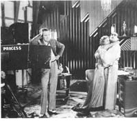 Movie Crazy1932. Monarch. Directed by Clyde Bruckman, screenplay by Vincent Lawrence. With Harold Lloyd, Constance Cummings Having caused one disaster after another, Harold Lloyd sputters "I am speechless. This is beyond words!" If only! This movie would have been so much better as a silent. And yet Lloyd's reedy voice is so in keeping with his eager-to-please character that he fares better than many other silent comedians did in talkies. Lloyd plays Harold Hall, a movie-struck Kansas boy who accidentally sends someone else's photo to Planet Studios and gets invited out for a screen test. The motif of mistaken identitymore precisely, of real identity versus movieland identitycontinues throughout. Harold becomes friendly with a blonde actress and also smitten with a dark, exotic Senorita he meets on a movie set, and he ricochets between the two without realizing that they are the same person. The actress's onscreen leading man is also her offscreen suitor. He acts suave on the set but blubbers drunkenly in real life. In the climactic scene, Harold and this actor battle it out on a pirate ship set with the cameras running, a fictitious scene turning earnest. This is one of two really interesting sequences in the movie, but I'll tackle the other oneHarold's screen testfirst. We already know that Harold is getting the test because of a misunderstanding, that he is painfully accident-prone, and that he's made enemies of many people at the studio after inadvertently ruining a location shoot.. We cringe when Harold, asked what kind of parts he plays, declares "Heroes!" and is issued a silk dressing gown and a sexy leading lady and directed to the "modern set." But we don't see him make the test. We only see the results along with the studio brass who gather in the screening room to check out the handsome new leading man they've been led to expect. As the test starts up, the camera moves in on the screen until we can't see the frame lines and that film becomes "our" film. It's wonderful. In the scene he's been assigned, Harold has to answer the phone and learn that he's been wiped out in the stock market. Well! He picks up the phone before it rings. Cut! He ignores the phone when it does ring. Cut! He gets tangled in the phone wires. He knocks the phone into a drawer, packs it into his suitcase, flings it over his head, etc. Take after take is ruined. To add to the fun, the camera keep rolling between takes but the projectionist speeds through these parts, making Harold and the director and the clapboard man jump around and talk in high-pitched gibberish. It's a brilliant choice to let us see this debacle being screened rather than being filmed. It's much funnier this way. For one thing, there's less anxiety since it's all over and done with; we can relax and enjoy a fait accompli rather than suffer along with Harold. Second, we can imagine the dismay of the screening-room audience, who we are in a sense standing in for (shrewdly, there are no reaction shots of them while the test is running). This gives us a double-view of what we are seeing. Best of all, watching this movie within a movie reminds us of the constructed nature of the rest of Movie Crazy, and of every movie. When, without warning, the film speeds up and Harold starts talking like Alvin the Chipmunk, we have to acknowledge that both Harold Hall and Harold Lloyd are plastic objects, not human beings. At the end of Movie Crazy Harold finally gets into a movie (inadvertently of course) and causes all the chaos we knew he would. This time we see it as it is happening. Harold is unconscious inside a trunk that gets pulled onto the set where Mary and her leading man are filming the climax of their Spanish Main picture. Harold revives just in time to see this guy manhandling Mary, and of course he leaps to her defense. The director has given instructions to keep the cameras turning no matter what (always a mistake), so the stage hands keep pumping in water, the wind machine keeps blowing, the set keeps rocking, Mary keeps swooning, etc., while Harold and his rival nearly drown each other. We've seen this many times beforean unsophisticated person mistaking a staged scene for something that's actually happening. On one level, it's absurd; as anyone who's ever been on a movie set knows, there is no way a person could ignore the lights, the crew, the camera and believe he's really on a ship. But the important thing to Harold, a literal guy, is that Mary is being threatened by that drunken actor, never mind that they're in costumes and makeup at the moment. When he pops from his hiding place and starts pummeling the guy, Harold is in a sense rejecting all that playacting stuff and asserting the primacy of real life and genuine emotions. Predictably, his impassioned reaction also makes for great cinema. The assistant director looks on delighted. The studio head stops to watch, loves the "comedy," and declares "We must sign him at once!" Harold protests, "That was a real fight. I wasn't acting. I ruined everything." But the studio head, no dummy, declares, "You made me laugh whether you intended to or not." Once again, a kid has become a star on the basis of his natural qualities. By rejecting movies, he succeeds in movies. This is the paradox of the backstage film: artificiality and genuineness keep trumping one another. Movie Crazy offers wonderful behind-the-scenes movie studio atmosphere. We hear the director and cameraman talking quite realistically, even technically. During a location shoot, we notice the camera tracks and the cables on the ground, and watch how the assistants keep onlookers back and quiet. We tour the sound stages with Harold, passing a snowed-in cabin, a row of palm trees, a cozy living room, a bombed-out village, and a couple of bathing beauties cavorting in front of a back-projection screen. To set up the big fight scene, we're carefully introduced to the camera, the sound recorder, the wind machine, the lights, the 