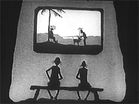 The Original Movie1922. Dawley Productions. Directed by Tony Sarg. Photographed and edited by Herbert M. Dawley. 1920s-era sophistication is still accessible to us, its collegiate irreverence erratically perceptible these 80 years later. Tony Sarg's The Original Movie is a good example. This animated short transposes modern movie-making to prehistoric times, with a (literally, for once) Neanderthal producer, scenarios written on scrolls, and dinosaurs used as camera dollies. Sarg, a puppeteer, made a series called Tony Sarg's Almanac that traced features of modern life back to prehistoric times with apparently hilarious results (the only other one that survives is called The First Circus). The Original Movie starts by breezily discounting the official story about the birth of motion pictures. "This is way everyone believes motion pictures were first made," says a title introducing a brief Leland Stanford/Eadweard Muybridge/ racehorse sequence. Then it asks, "But what about the troubles of movie authors and producers in the cave days?" and flashes back to movie production at the Stonehenge Film Company. It finds arch, self-congratulatory humor in re-imagining 20s technology in stone-age terms. The cameraman drives the camera by pedaling, bicycle-like, and the actors are recognizable vamps and lounge-lizards clad in animal skins. The underlying joke is that, then as now, insensitive producers, undisciplined performers, and ham-fisted censors destroy a writer's work; the put-upon scenarist doesn't recognize his story when he sees the finished film projected onto a boulder. Mating a stone-age setting with a contemporary sensibility is amusing ("The Flintstones" ran for years on just this premise). But a more significant historic dislocation in this movie may be one that Tony Sarg didn't actually intend. Sarg worked in a style that he called "shadowgraph" animation. The entire story is told in silhouette, like an Indonesian puppet show, just black shapes against a white or gray background. The effects are quite beautiful and surprisingly expressive. And inescapably these shadowgraphs recall earlier, pre-mechanical forms of moving picturesliving statues, shadow plays, and magic lantern shows. It's not just nostalgia, it's a different kind of "motion picture," more pictorial, more stylized, more participatory than the photographed reality that by 1922 had clearly won out. For all its facetiousness, there is something poignant about The Original Movie, constructed as it is from cut-outs, shadows, and silhouettes. It actually does show the origin of motion picturesnot in the comical "cave days," but in the novelty-loving 19th century. |