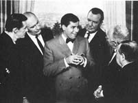 The Patsy1964. Paramount. Directed by Jerry Lewis; written by Jerry Lewis and Bill Richmond. With Jerry Lewis, Everett Sloane, Keenan Wynn, Peter Lorre, John Carradine, Phil Harris, Ina Balin The amazing line-up of character actors listed above play the entourage of a famous comic killed in a pre-credits plane crash. They'll be out of work unless they can find a replacement. Just as they're pondering their plight, guess who arrives from Room Service? A hint: he drops a tray of glasses, spills ice all over the floor, trips over furniture, nearly knocks himself out by causing the door to rebound and hit him in the head, and then falls off the balcony, babbling incoherently the whole time. Le roi du crazy strikes again! By 1964, Jerry Lewis had become so self-conscious that his movies induce claustrophobia. There's a whole lot of Jerry in a pretty tight space; he bounces off the walls in more ways than one. The Patsy is probably the most extreme example of Jerry congratulating himself on how far he has come since those days of curling up in Dean's lap. Take, for example, the very end of the movie. Stanley, the Jerry character, once again loses his balance and disappears off the hotel balcony. Horrified, his fiancee stands by the railing sobbing (the shot is from inside the hotel suite). Then Stanley strolls by, outside, apparently on a ledge. But it's not Stanley--it's Jerry! "Aren't you overacting a bit, Miss Balin?" he says. It's only a movie, he reminds her, and he removes a chunk of the parapet to demonstrate that it's papier mache (talk about breaking the fourth wall!). He gestures toward us: "The people know I can't die! I'm gonna make more movies." He looks past Ina Balin and calls to the crew, "Okay, that's lunch! Take an hour. . ." A reverse shot shows us the crew, cameras, the rest of the sound stage, other sets in the background. The crew disperses, the lights shut down, and everybody follows Jerry across the darkened stage past a huge flat painted with the words The Patsy. Whoa! Yep, that Jerry is some big macher. When he gets self-referential, it's Self with a capital S. At least this mock-Pirandellianism is in keeping with the movie's overall strategy, which is to show Jerry metamorphosing from his broadly comic Martin-and-Lewis character into the suave, condescending, self-adoring big shot whom Jerry apparently considers his more attractive self. The transformation happens gradually "the boys" groom Stanley for stardom (new wardrobe, singing lessons, recording session, nightclub appearance, press interviews). He stops twitching, he starts speaking in coherent sentences, his voice lowers, he achieves a rapprochement with breakable objects. He looks jowly all of the sudden, and you notice the big rings on fingers that look like they should be holding a cigarette. He starts stroking his hair. It's as though Jerry, now freed of all collaborative constraints on his image, can't stand having us continue to think of him as only a slapstick clown--he's got to turn sexy, suave, and sincere. By the penultimate scene, Stanley has become a smooth operator giving orders to his former "handlers" ("Call Las Vegas . . . I'll need a whole new wardrobe. . .") We know he's turned into a real man because he orders the girl to marry him (she's thrilled). We see this transformation in microcosm in the skecth that Stanley performs on the Ed Sullivan Show, the appearance that makes him a star. In it, a babbling movie fan (a lot like Jerry's character in Hollywood or Bust) finds a ticket to a big movie premiere, but can't get in because the affair is black tie. He ducks into an alley and uses house paint and glue to literally transform his klutzy outfit into a tuxedo and top hat; the sketch ends (to thunderous applause) as he strolls into the theater looking for all the world like Fred Astaire. So in a story centered around Jerry's "cleaning up real good", it seems a logical culmination to have him completely transcend the movie at the end. In case we haven't got it, he has to insist that, far from being some retard, he's the guiding intelligence behind everything we've seen up til then. The transformation is complete: from patsy to master of the universe. There's one final sequence: Lorre, Wynn, Harris, Sloane and Carradine walk out one at a time to take a little curtain call as their names appear on the screen. This is all in real time in one continuous shot. Then there's a cut, and Jerry makes a far more spectacular entrance, coming in through a door, bowing graciously, and then giving us a somewhat perfunctory final pratfall over a chair. This odd little scene seems to me a reversal (and a painfully childish one) of the beginning of the film. These five black-suited men who initially manipulate and exploit poor Stanley are revealed as aging character actors reduced to accepting work from beneficent celebrity-director Jerry Lewis. Stanley/Jerry changes from victim to benefactor, and he makes sure that his actors and his audience know it. Jerry is apparently such a Hollywood big shot that he has talked a bunch of stars to make guest appearances in The Patsy. There's a clever mirror-shot with George Raft, and a party scene where Stanley is supposed to suck up to Hedda Hopper but instead has a hysterical fit over her absurd hat. Stanley's publicist is horrified, but Hedda is charmed: "He hasn't yet learned to be phony," she says. "He's real. . . and honest. . ." (Jerry Lewis, real?). A trio of minor show-business journalists make an appearance. And to show that Stanley's reputation is building around Hollywood, three "celebrities" express their admiration: Rhonda Fleming, Mel Torme and Ed Wynn! There are a number of very funny scenes in The Patsy. But it's hard to imagine that many viewers these days can shrug off the really unpleasant, obsessive self-aggrandisement that pervades the movie. If it were just a display of Jerry Lewis's own particular pathology, The Patsy would not be especially interest