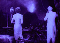 Rose Hobart1936. By Joseph Cornell. With Rose Hobart. Salvador Dali was present when this film was first shown, and he became so enraged that he knocked over the projector. Dali said it was exactly the film he had been planning to make, and that Cornell had intuited his idea and stolen it. It's a funny story, and if you have seen Rose Hobart you probably know it already, since I got it from the program notes to the Treasures from American Film Archives DVD, which has finally made this curious little film widely available. Rose Hobart is called an "independent" film, but that's an understatement-it's a one-man film, created in seclusion. The few times it was shown, Cornell ran the projector and played records to accompany it. Until 1969, only a single print existed. Still, I hesitate to repeat the Dali story because it suggests that Rose Hobart needs a big-name connection to give it artistic legitimacy. Many would say that Joseph Cornell is a more important artist than Dali, and that Rose Hobart shows a better sense of cinema than those "dream sequences" Dali so ostentatiously collaborated on. Dali filmed donkey carcasses, oozing cow eyeballs, animated maggots, and trompe-l'oeil scenery; Cornell achieved a similar effect using a 16-mm print of a film called East of Borneo and a pair of scissors. Cornell's medium was assembly. He is famous for building wooden boxes composed of smaller boxes filled with found objects and cut-out images. This is a cliché now, but Cornell's originals are incredibly beautiful and strange. There is a powerful logic to them, but it's not one you can put into language. Many of his works are tributes to movie actresses. Rose Hobartnamed for the star of East of Borneo-is likewise an assembled thing. Cornell has rearranged footage from that film, slowed it down to silent-film speed, and turned it all purple. The result is 19 minutes plucked from East of Borneo, sometimes quick shots, sometimes sequences several minutes long with the original editing intact. Unlike many later collage films that throw hundreds of disconnected images at us, Rose Hobart retains enough narrative to be tantalizing. Just as we start to figure out a scene's spatial and interpersonal relationships, he introduces a shot of the natives clubbing crocodiles or the volcano exploding or Rose in some other situation. There's a sense of a narrative struggling to gather enough energy to move itself along, but never succeeding. This is underscored by Cornell's tendency to cut to a shot just as a door is closing or a person is leaving the frame or the scene is fading out The original plot is no longer discernible, although there seem to be a couple of of white people on a jungle island. Cornell's interest lies with the beautiful Rose Hobart, as she floats before us wearing ridiculous outfits, caught in indecipherable situations, sometimes doing the same action repeatedly, usually looking vaguely distressed. There is no sound; Cornell accompanied the film with samba records from his collection. Rose Hobart has solid surrealist bona fides. Certainly Dali would have recognized its dream logic, its ominous eroticism, the shadowy moon, and the out-of-nowhere manifestations of strange creatures and natural disasters. The surrealists were always claiming that film was the perfect medium for portraying the workings of the unconscious. They were interested in incongruities and shock effects; Cornell knew what he was doing when he chose as his medium a film that provided footage of volcanoes, crocodiles, monkeys, natives in headdresses, a lunar eclipse, and a woman in drag. But Rose Hobart is almost sur-surrealist, thanks to Cornell's idea of making his art film from a mainstream commercial film. His raw material is already full of resonance for anybody who has seen Hollywood movies. We know something, but apparently not as much as we thought, about how to understand a beautifully-lit face, a melodramatic hand-gesture, a classically-edited conversation, a dissolve, a tracking shot. Cornell reveals the dreaminess built in to moving pictures in general and the Hollywood melodrama in specific, a dreaminess usually disguised by the story being told. LIke the famous Dadaist urinals, hats, and spoons (and like the much later soup cans and Brillo boxes), Rose Hobart puts an everyday thing into a new context. A few shots in Rose Hobart come from sources other than East of Borneo. The most striking is a twice-repeated image of a drop of water falling into a pool of some kind. It's a slow-motion, hyper-close up, very weird and beautiful. As the drop hits, a kind of corolla rises; the surface undulates; a glint appears in the middlethe moon's reflection, perhaps, or the iris of an eye. It seems that a mystery of the universe being revealed. And although this is juxtaposed with some of the most absurd footage that Hollywood ever produced, it seems oddly in place. Film records the natural and the contrived, and turns both into something else. |